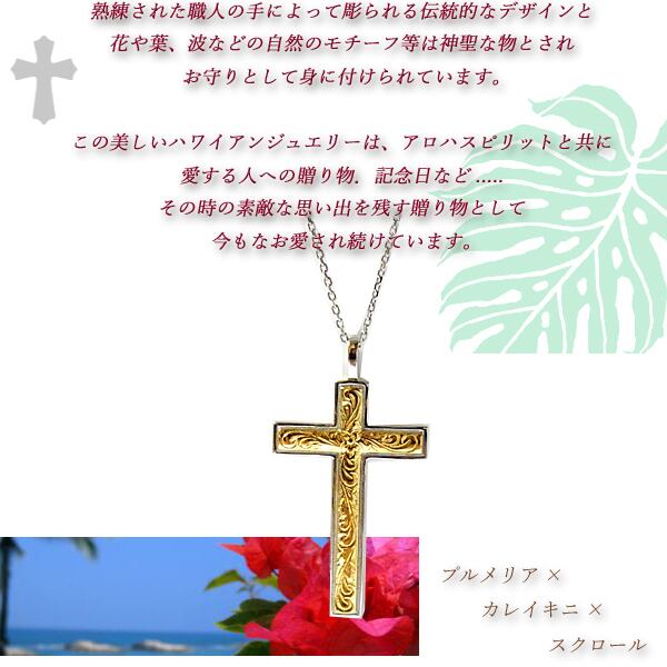 ハワイの花「プルメリア」とハワイの波「スクロール」を合わせた「Princess」をモチーフにした神聖なクロスネックレス。