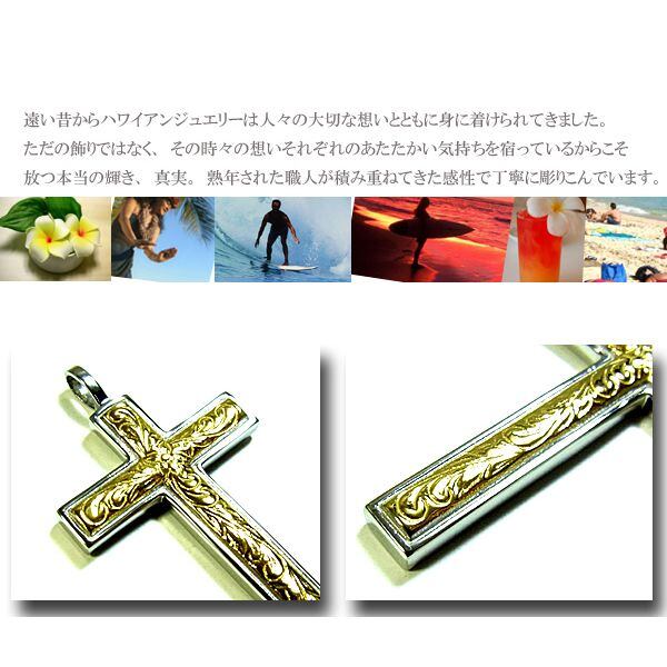 ハワイアンジュエリー ネックレス クロス ペンダント メンズ レディース 金属アレルギー対応 プルメリア スクロール サージカル ステンレス PVD イエローゴールド gps8792