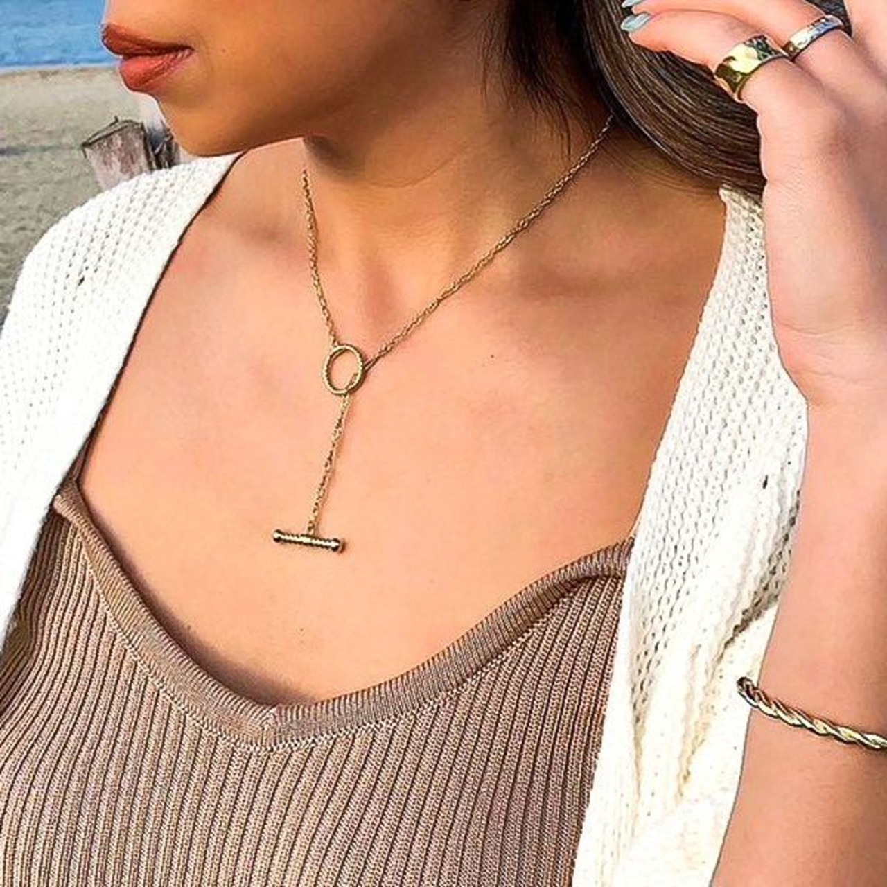 胸元が大きく開いたトップスに合わせると、こなれた雰囲気に仕上げます。